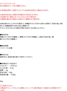 ●栄養成分(100g当り) エネルギー・・・327kcal たんぱく質・・・0.3g 脂質・・・0g 炭水化物・・・82g 食塩相当量・・・0.89g 90g【メーカー・製造または販売元】株式会社 シーワン098-852-7766【広告文責】株式会社イージャパンアンドカンパニーズ 072-875-6666《ご注意ください》 ※商品がリニューアルしている場合、リニューアル後の商品にてお届けとなる場合がございます。