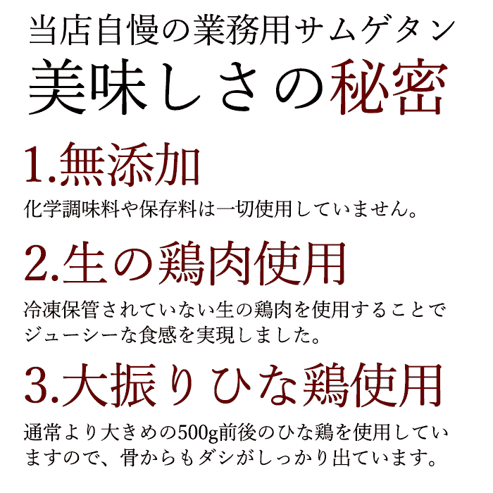 (お好みで塩を少々入れてお召し上がり下さい) ●通常は冷凍肉を使うといわれている参鶏湯の若鶏ですが、本品の若鶏(韓国産)は一度も冷凍されていない、生肉を使用していますから、類似品に比べてお肉の旨み、やわらかさがまったく違います。