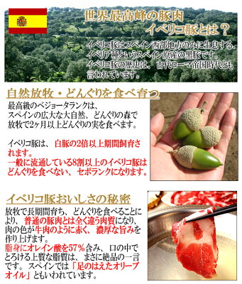 ■イベリコ豚は鹿児島の純粋黒豚/ホエー豚/十勝野ポーク/清浄豚/平牧三元豚/やまと豚/シルクポーク/下仁田ポーク/ピュアポーク/スーパーゴールデンポーク/林SPF/夢ポーク/高座豚/越後もち豚/ケンボロー 芙蓉ポーク/媛ポーク/梅肉ポーク/観音池ポーク/霧島黒豚/六白豚/やんばる島豚/あぐー豚/元気豚/SPF豚/松坂ポークを完全に凌駕する世界最高峰の豚肉といわれています まとめ買いがお得♪